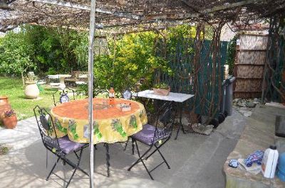 Unter einer schattigen Weinlaube befindet sich einer der schönsten Plätze auf dem Gelände.