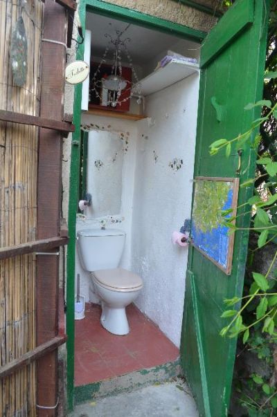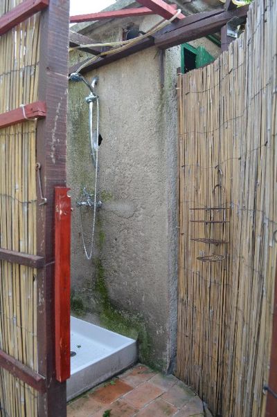 Hinter einer schützenden Schilfwand findet man eine Außendusche und auch eine Außentoilette.